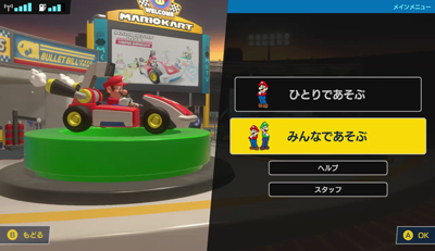 如「大家一起遊玩」表示為灰色而無法選擇,請先選擇「一個人遊玩」並開始遊戲。請跟從畫面指示製作賽道,完成「首場比賽」後,便能選擇「大家一起遊玩」。