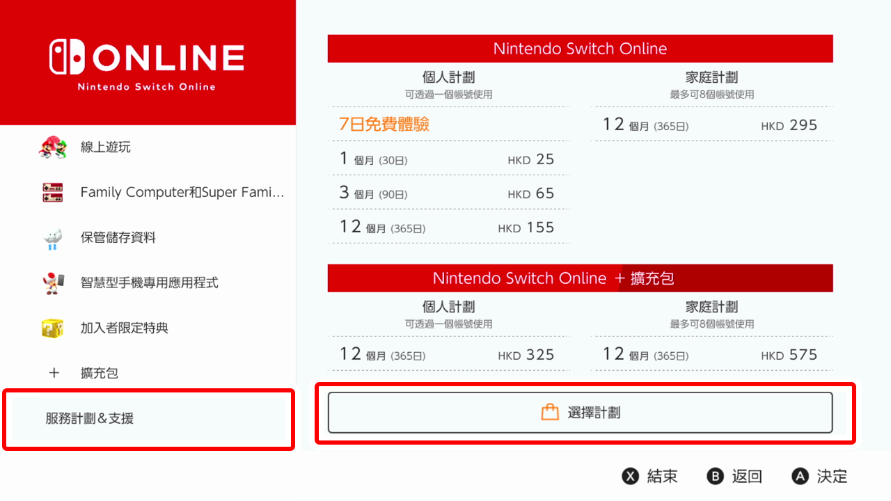 選擇「服務計劃&支援」的「選擇計劃」(會跳到Nintendo eShop的畫面)。